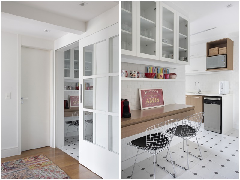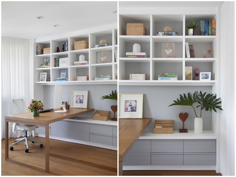 Ao iniciar as obras, as arquitetas descobriram que havia um pilar imenso entre o quarto que seria integrado à sala para virar escritório. A saída encontrada foi deslocar o banheiro vizinho ao quarto para promover a integração dos espaços. “A cozinha não foi integrada à sala, mas ganhou uma porta de correr bem larga, com algumas partes de vidro transparente, voltada para o hall de distribuição dos quartos“, revela Cecília.