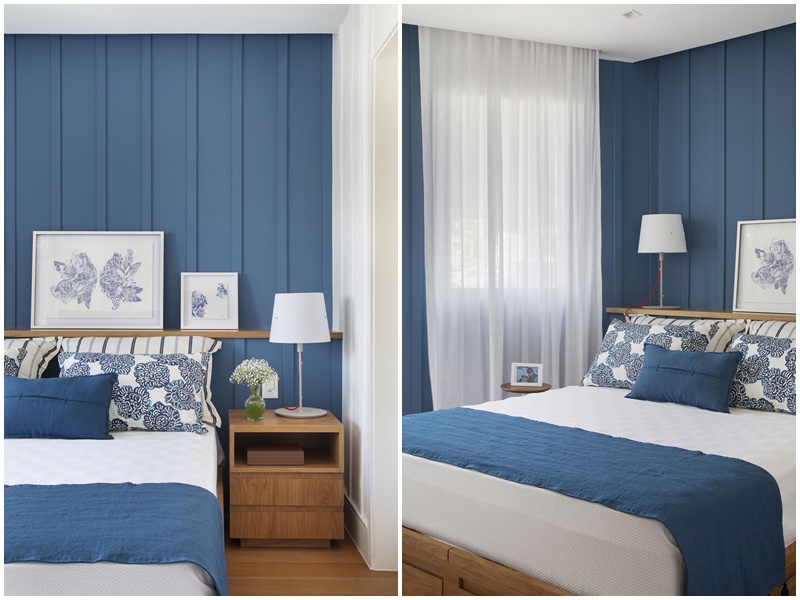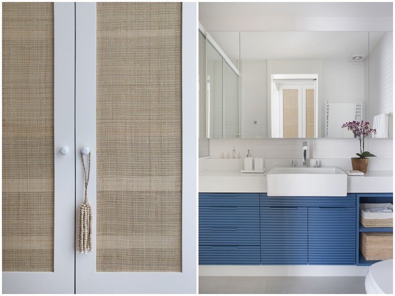 Como a cliente queria um quarto azul, as arquitetas pintaram as paredes num tom comumente associado ao estilo Ralph Lauren e, para não pesar visualmente, usaram branco no linho da cortina, em parte da roupa de cama e em alguns adornos. Para completar o estilo casual chic que consagrou o estilista americano, o armário ganhou portas de palhinha natural.