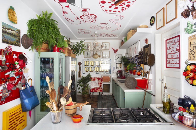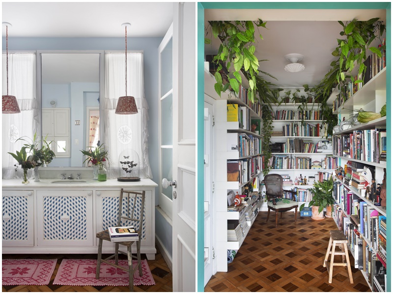 Outro ambiente que chama a atenção é a biblioteca do apartamento, repleta de livros de arte, moda e literatura, que agora contam com a companhia de Syngoniuns e Filodendros, estrategicamente posicionados na prateleira superior para formar uma cascata verde que tende a se avolumar com o tempo. Nem a cozinha foi poupada. Aberta para a sala, ela foi invadida por Samambaias, Dracenas, Syngoniuns e Jiboias, que se enfileiram no alto dos armários.