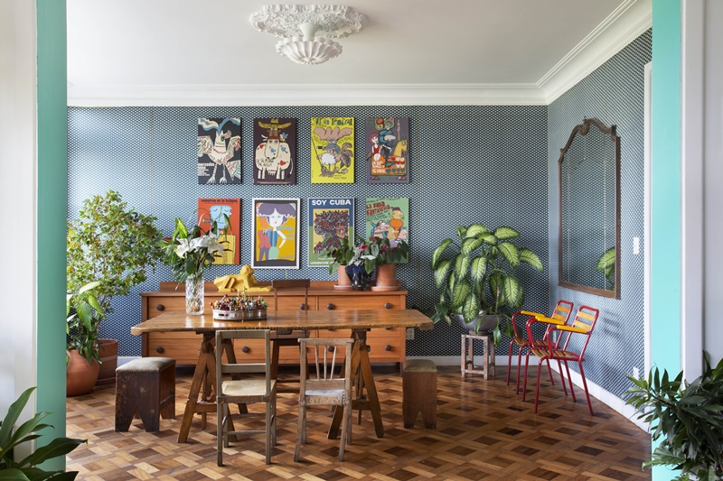 Em função da pandemia, este ano a estilista carioca Isabela Capeto usou o próprio apartamento de 232m2, localizado em um charmoso edifício dos anos 50 na Avenida Ruy Barbosa, como cenário para gravar um vídeo de apresentação de sua nova coleção Brotar, dirigido por Caio Blat e Luisa Arraes e exibido no dia 4 de novembro do ano passado, logo na abertura da SPFW. Para quem não viu, o elenco principal do vídeo é formado por um grupo de dança que evolui pelos cômodos da casa, exibindo (além de máscaras, claro!) vestidos típicos da autora, com muitos detalhes artesanais, babadinhos, debruns, bordados, estampas coloridas e geométricas.