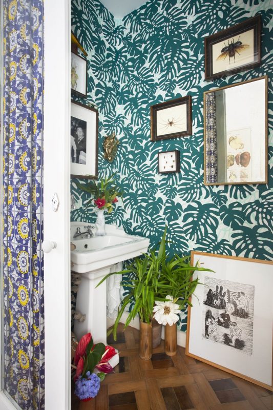 Voltado para uma pedreira (o Morro da Viúva), o quarto da estilista também ganhou um banho de “verde”, especialmente a varanda, que foi completamente tomada por Vriesias, Neomaricas, Pleomelles e Dracenas. “O lavabo nem precisava de plantas porque as paredes revestidas com tecido estampado de folhas de Costela-de-Adão já lembram uma selva urbana. Mesmo assim, não resisti e salpiquei algumas Dracenas em vasos de bambu”, brinca a paisagista.