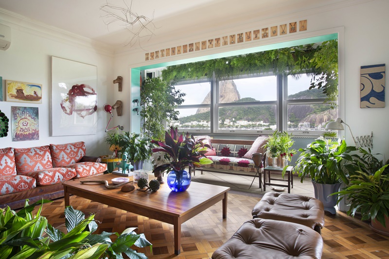 A varanda coberta do living é, sem dúvida, o ponto alto da interferência promovida pela paisagista, com plantas das espécies Asparagus, Syngonium, Ficus, Leea e Spathiphyllum (Lírio-da-paz) distribuídas no alto de todo janelão, que tem vista indevassável para o Pão-de-Açúçar. “É um quadro vivo de grande impacto visual, que arranca suspiros de qualquer um. Repare como as plantas que inseri no espaço se confundem com as copas das árvores do Parque do Flamengo”, avalia Rothier.
