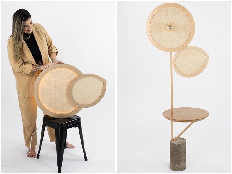 As luminárias Flor de Buriti e Palmeira de Buriti destacam o potencial da palha brasileira. “O toque na palha nos faz ter contato com a natureza”, comenta a designer Rayssa.