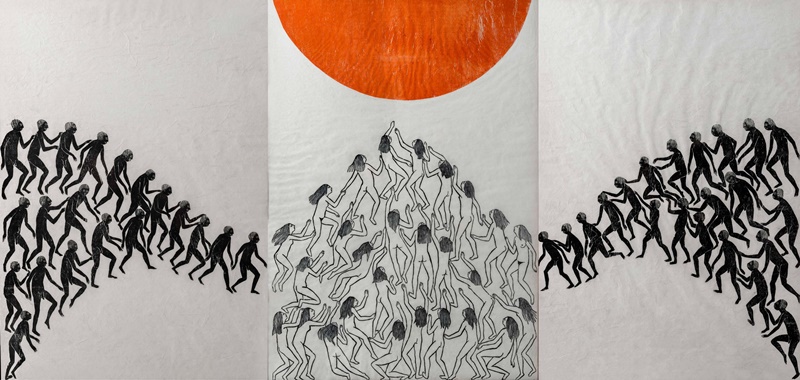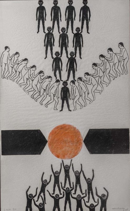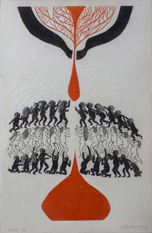 Entre as xilogravuras apresentadas na exposição está o tríptico “O encontro” (1971), “a maior e a mais despojada e impactante xilogravura realizada por Wilma Martins”, segundo Frederico Morais. “É uma releitura do painel central do políptico Adoração do Cordeiro Místico. Uma magistral redução minimalista da obra do pintor flamengo. Wilma começou eliminando o cordeiro (a redenção), mantendo apenas o vermelho do altar, que de retangular se transformou em semicírculo. Na gravura de Wilma, as figuras femininas, escavadas no branco, corresponderiam às “anjas” que circundavam o altar. Agora, bem juntas, buscam ascender até o semicírculo vermelho. As figuras masculinas, negras, em conjuntos simetricamente agrupados, corresponderiam aos dois grupos humanos que aparecem, como que imobilizados, em primeiro plano na pintura de van Eyck – prelados com suas vestes vermelhas à direita, os demais representantes da sociedade civil à esquerda. Ambos se movimentam em direção à pirâmide de mulheres, para expulsá-las dali ou, ao contrário, para nelas se fundirem e juntos ascenderem. Desvestidos por Wilma, homens e mulheres, brancos e negros, anjos e humanos todos se igualam em sua humanidade. Ou não”, ressalta Frederico Morais.