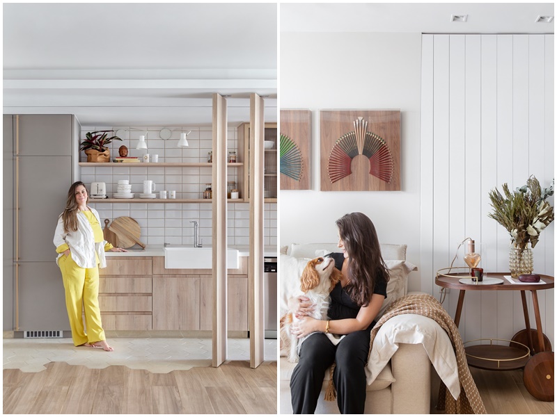 A arquiteta Camila Fleck, que assina o projeto e a moradora Mayara, com a pet Pipa