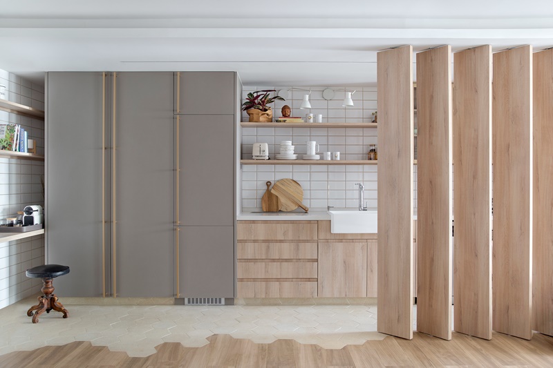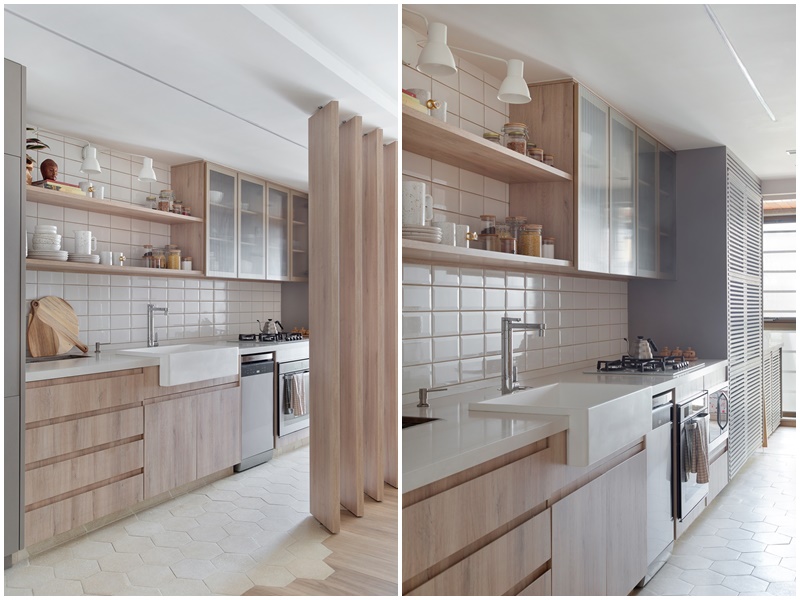 O projeto buscou criar espaços aconchegantes e estilosos, ao mesmo tempo, e adotou uma paleta de cores em tons suaves para deixar o apartamento claro e bem iluminado. A cozinha, por exemplo, tem cuba em estilo farm sink (que remete à fazenda), piso de ladrilho hidráulico com formato sextavado (que se funde com o piso de porcelanato amadeirado do setor social), paredes de cerâmica branca com toque retrô e armários com portas amadeiradas e cinza/fendi, combinadas com portas de vidro canelado. Ainda, brises verticais giratórios (com acabamento em melamina amadeirada) foram instalados entre a sala e a cozinha, não só para oferecer privacidade e controle da luz natural, quando necessário, como também para criar uma conexão visual elegante entre os espaços. Na sala, destacam-se também os painéis de parede de marcenaria, ora em lambri branco ora em melamina amadeirada, alguns móveis de madeira e detalhes em couro natural caramelo.