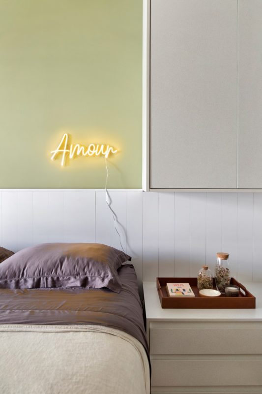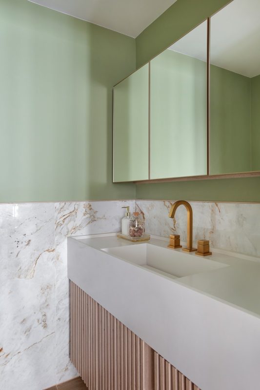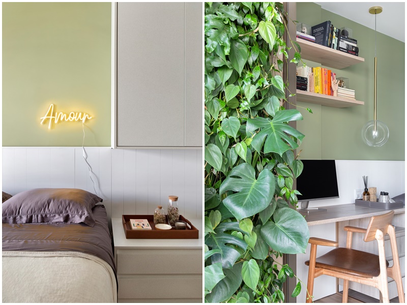 No quarto do casal, a tinta verde aplicada nas principais paredes é uma solução simples e de baixo custo que fez toda a diferença no resultado final. Já a combinação do revestimento em tijolinho claro na parede da tv com a marcenaria branca e a cortina de linho branco ajudou a suavizar a paleta cromática do espaço, ao mesmo tempo que acrescentou diferentes texturas. Outros destaques deste cômodo são o espelho giratório alongado ao lado da porta de entrada, fixado no piso e no teto, e o jardim vertical da varanda.