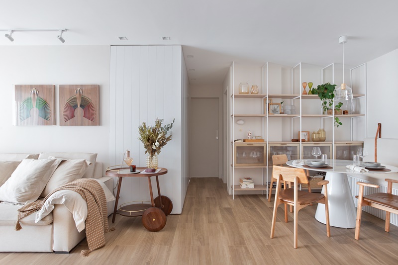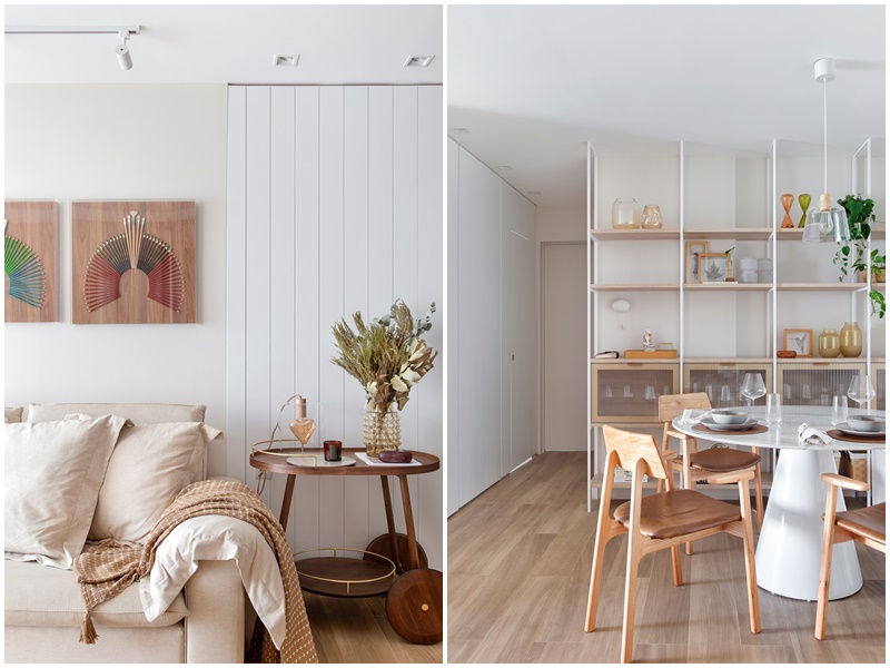 Na decoração, que segue o estilo contemporâneo com pitadas de bo-ho, algumas peças de valor afetivo já faziam parte do acervo dos clientes e foram aproveitados no novo lar, a exemplo do banquinho antigo de madeira (em destaque no canto da cozinha), o vaso de vidro exposto no carrinho-bar, os quadros da sala acima do sofá (cocares indígenas desenhados com lápis de cor) e a escultura Nuvem com Balanço, da designer Nara Ota (fixada na parede da estante da sala. Entre os móveis novos, na área social ela destaca as cadeiras Dera (da Lider Interiores), o carrinho-bar Moon e a estante que vai do piso ao teto.  “A estante serve de apoio à mesa de jantar, ao mesmo tempo que funciona como aparador ou buffet. Além disso, sua estrutura vazada de serralheria branca e os módulos de marcenaria fechados com portas de vidro canelado não pesam visualmente no ambiente”, justifica a arquiteta.