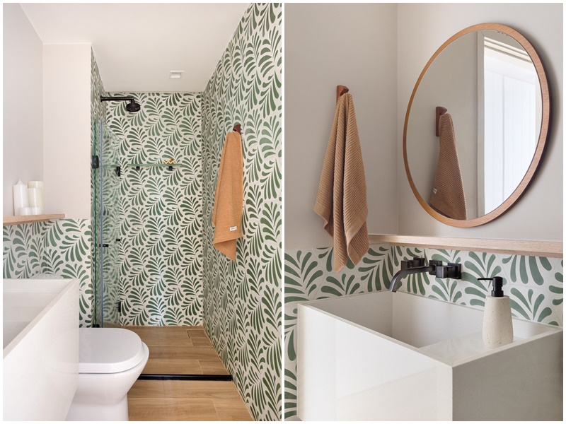 • O banheiro social com cara de lavabo, graças ao revestimento ousado das paredes, em ladrilho hidráulico sextavado, com estampa de folhas verdes estilizadas.