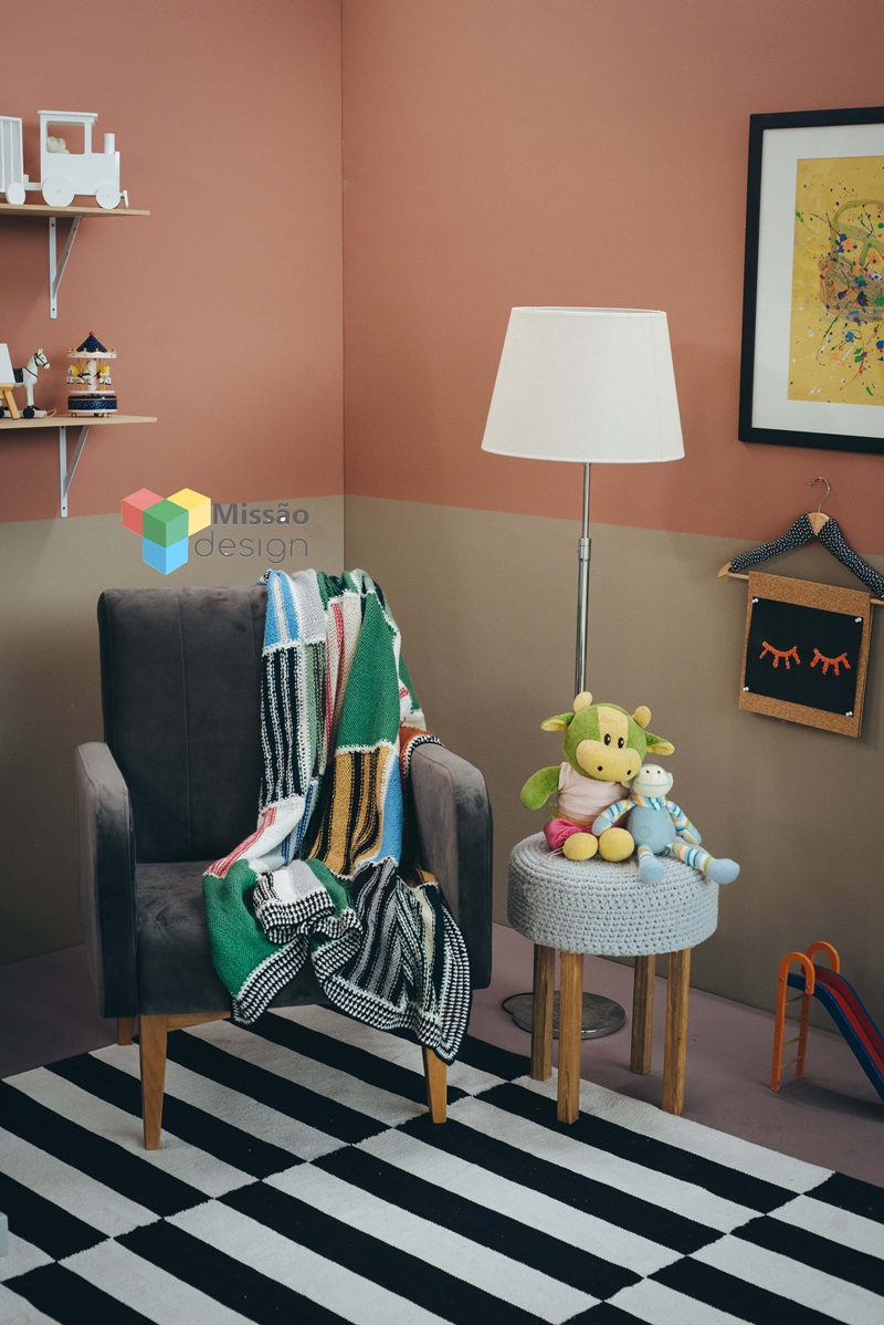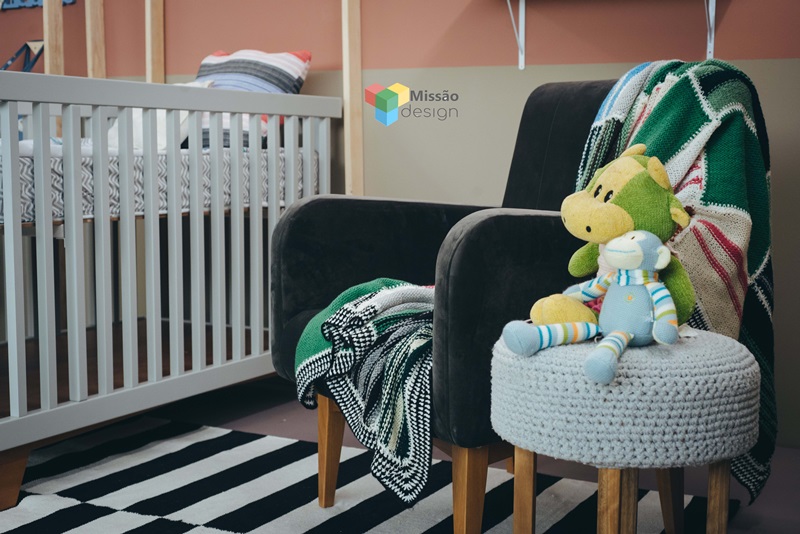 No projeto vencedor desenvolvido por Fabiano, à frente do FPR Studio, ele optou por uma paleta de cores mais terrosa e por elementos com estética mais neutra, capazes de integrar a decoração de um quarto de bebê menino ou menina. O arquiteto utilizou, por exemplo, cores sóbrias e menos convencionais na pintura bicolor da parede, assim como nos móveis, objetos, brinquedos e demais acessórios, sem deixar de lado o clima acolhedor e a essência lúdica e alegre característica do ambiente.