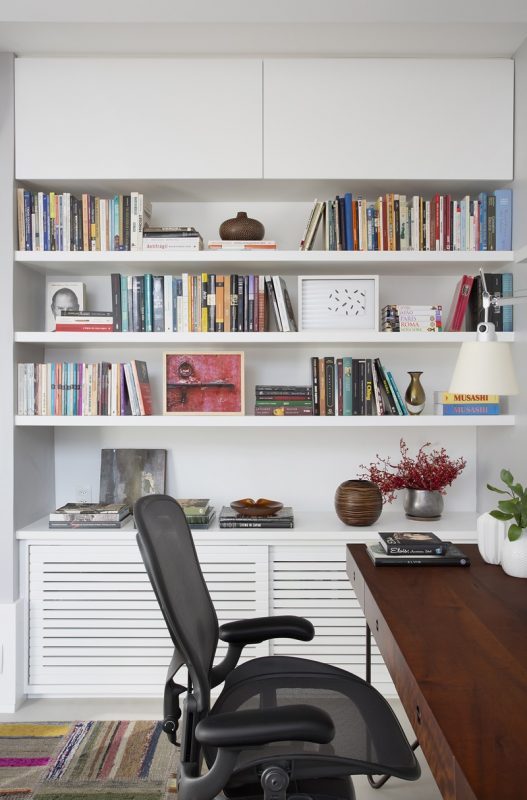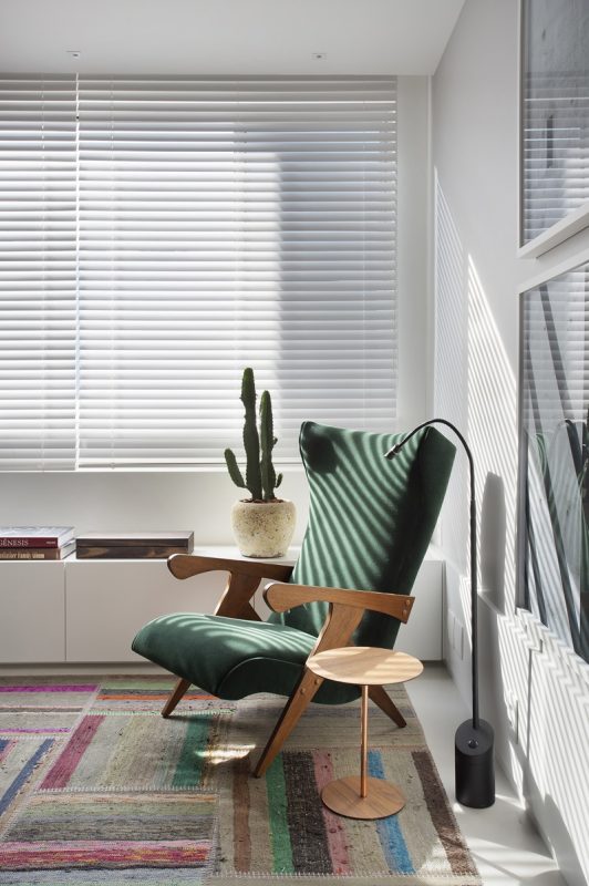O escritório segue a mesma orientação do living, com base neutra e pontos de cor. “Elegante, simples e muito funcional”, nas palavras de Adriana, o espaço ganhou marcenaria projetada pelas arquitetas e peças de design assinado que mesclam passado e presente: a moderna cadeira de escritório Aeron acompanha a escrivaninha Quilombo, de Arthur Casas, e foi ainda combinada à Poltrona Cuca, de Zanine Caldas.