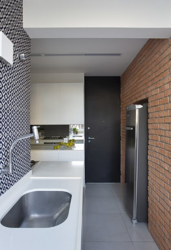 Já a cozinha ganhou uma decoração mais rústica, com direito à parede de tijolinhos e bancada de apoio em madeira, com banquetas. Nesse cômodo, a obra consistiu na retirada da porta entre a cozinha e a área de serviço, integrando os espaços através da aplicação de azulejos e da bancada em L, de um lado acolhendo a pia e o fogão, do outro o tanque e a máquina de lavar. Como trata-se de um ambiente estreito, de apenas 9m², as arquitetas optaram por reposicionar a geladeira para não atravancar a passagem, criando um nicho para embutir na parede de tijolinhos, tirando apenas alguns centímetros do quarto de empregada, usado pelos moradores como despensa.