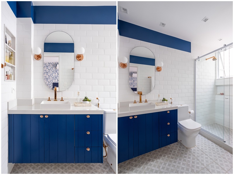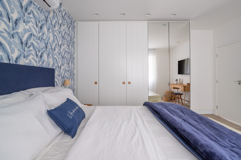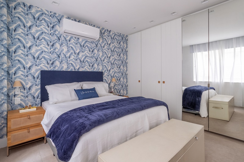 O azul dá o tom à suíte do casal, com papel de parede floral e cabeceira estofada em ton sur ton. Para completar o clima de frescor, mesas de cabeceiras e arandelas de palhinha. E a mesma paleta de cores continua no banheiro do casal com portas do armário laqueadas em azul e piso original de azulejos.