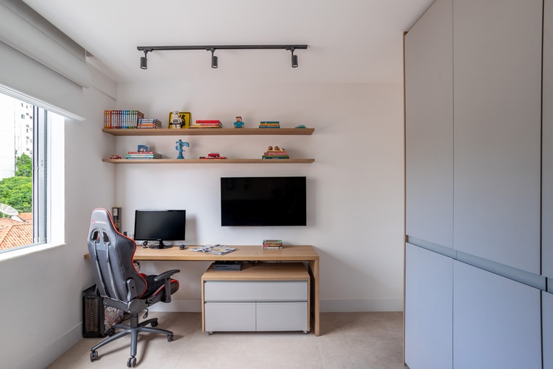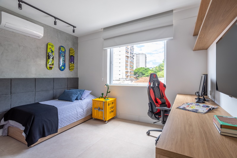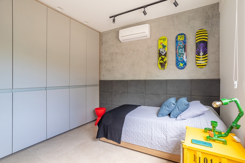 Com uma pegada bem moderna, o quarto do filho tem shapes de skates na parede, mesa de cabeceira amarela que lembra um contêiner, parede de cimento queimado, bancada de estudo e cama de solteiro estofada com lona estonada cinza. “São 14m2 bem distribuídos e um ótimo armário em laca cinza de três metros lineares”, diz Ana.