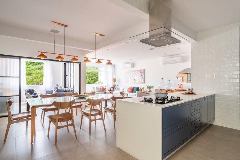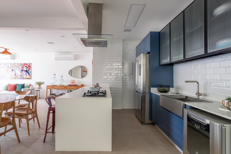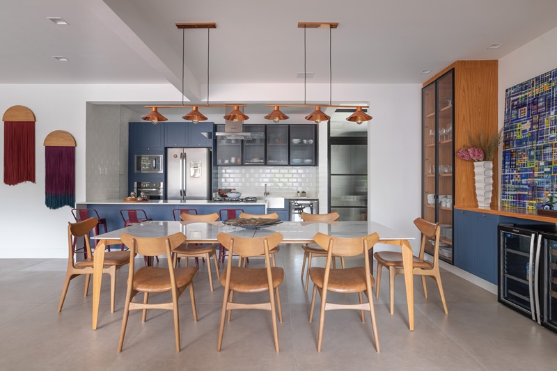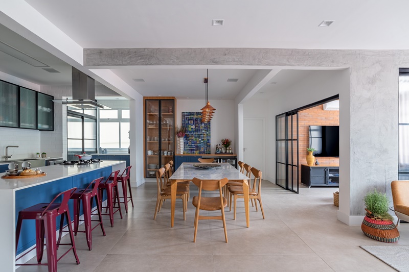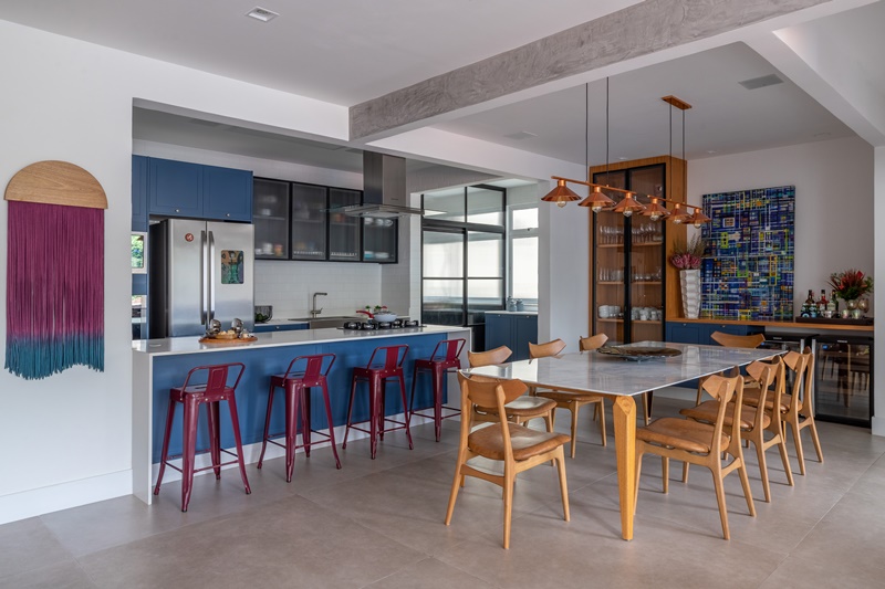 A sala, o home e a cozinha são totalmente integrados, amplos e claros. Com paredes revestidas em cerâmica metro white, a cozinha tem portas laqueadas de azul que se alternam com outras de vidro canelado e friso preto. Uma ilha central com cooktop e banquetas rosadas serve também de apoio à mesa de jantar com tampo de mármore e cadeiras de madeira clara, estofadas em couro. As obras de arte seguem a mesma paleta de cores. Um sofá cinza com direito à chaise, sintonizado com as poltronas de couro claras e as mesinhas de centro componíveis. Cestas coloridas servem de cachepots e completam o clima descontraído e relax do ambiente.