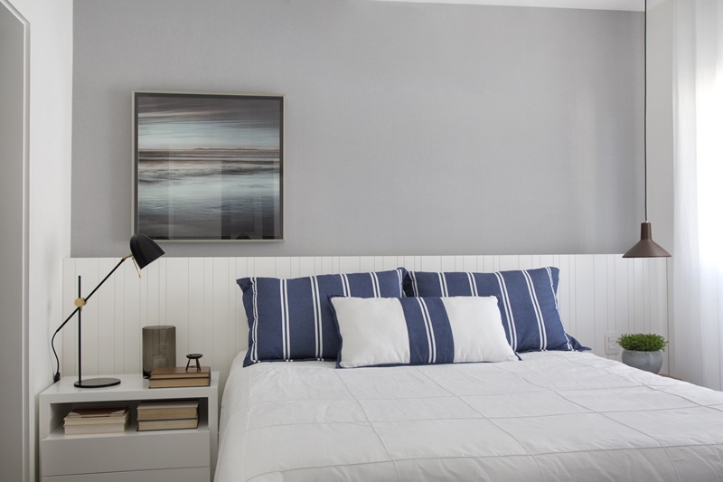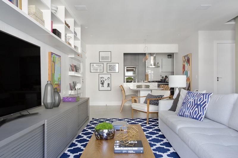 As arquitetas definiram a paleta cores a partir da escolha do piso, um porcelanato de cor cinza da Portobello, com opções de acabamentos para exterior e interior (por isso, o mesmo piso foi usado na sala, cozinha e varanda). O “volume” do novo closet na sala foi ressaltado com a presença da cor pistache nas paredes dele. Para aquecer o ambiente e deixá-lo mais masculino, foram usados tons de azul, preto e madeira.