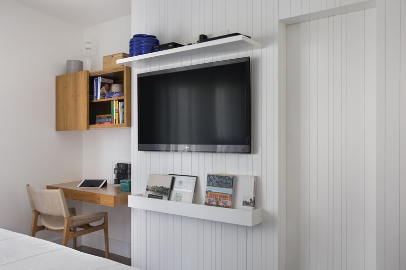 Muito pouco do apartamento original foi aproveitado. A exceção de um painel de parede de um dos banheiros, em jacarandá, que as arquitetas optaram por remover a pintura original e reaproveitá-lo no novo lavabo. Os tacos originais dos quartos, em peroba, também foram reaproveitados.
