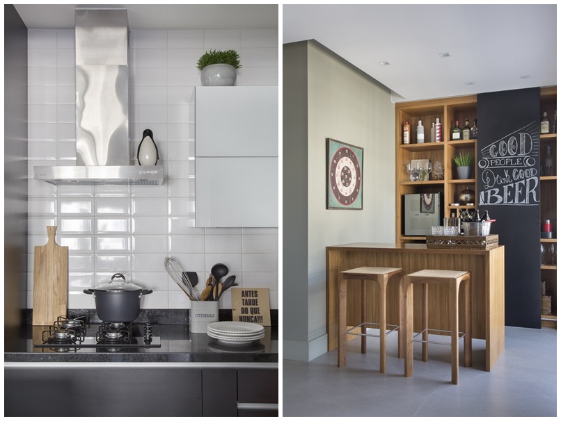 A decoração, contemporânea e bastante prática permite ao morador usufruir de todos os espaços sem muita preocupação com manutenção e limpeza, ótimo para receber os amigos em casa e tomar cerveja enquanto assiste a jogos de futebol.