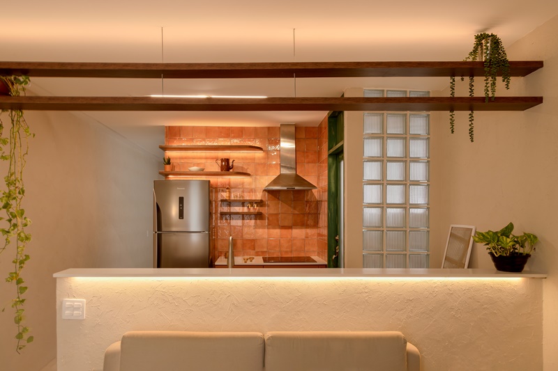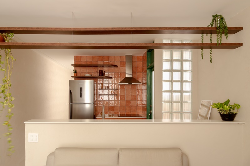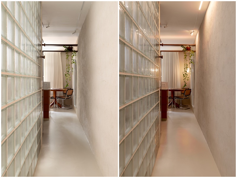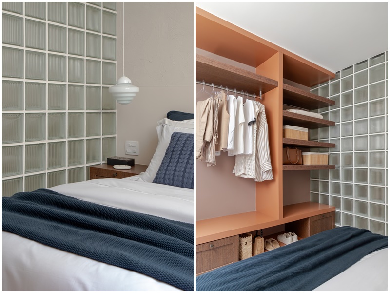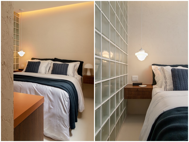 “O maior desafio era transformar a disposição dos cômodos, trazendo mais iluminação natural à sala. Assim, redefinimos completamente o layout do apartamento, invertendo o local da suíte pela sala e aproveitando a vista para a rua arborizada”, explica Mariana. A sala foi então realocada para perto da janela frontal, enquanto o quarto ganhou mais privacidade. Uma parede de tijolo de vidro foi erguida junto à cama para iluminar o corredor e manter a sensação de amplitude.