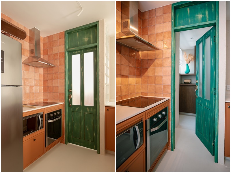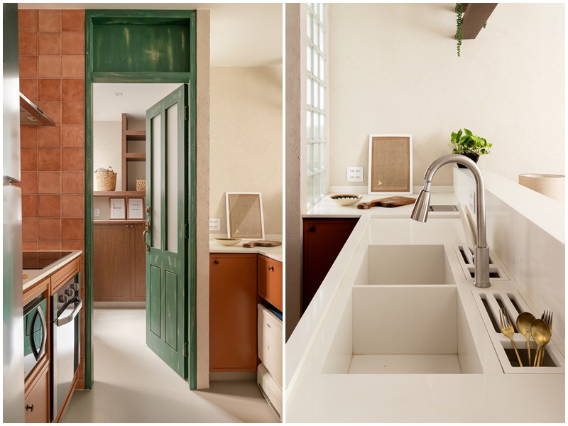 “Desde o início do projeto, ficou evidente a paixão da cliente por cores e tendências retrô. Por isso, a madeira escura, a porta de madeira maciça e as luminárias de vidro ganham destaque nessa proposta, conferindo ao espaço muita personalidade”, conta a arquiteta.