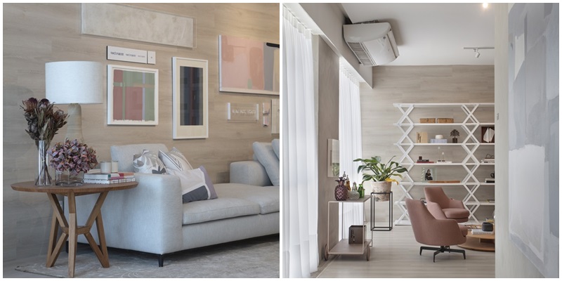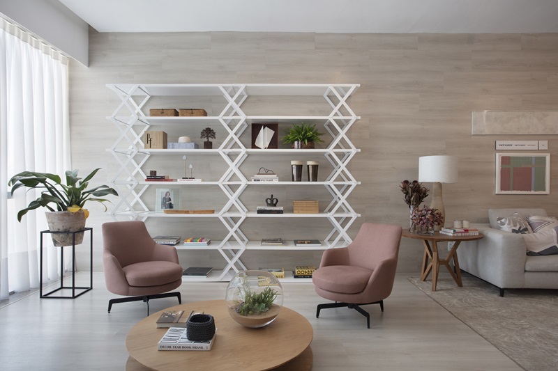 Sala de estar feminina e aconchegante, assinada por Patricia Fiuza para o Morar Mais por Menos Rio de Janeiro, apresenta formas inusitadas de usar revestimentos