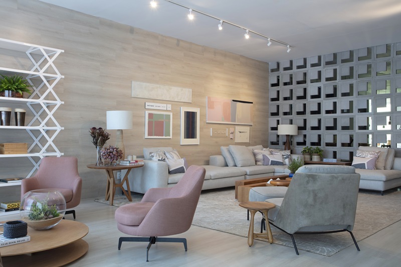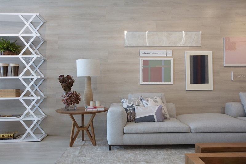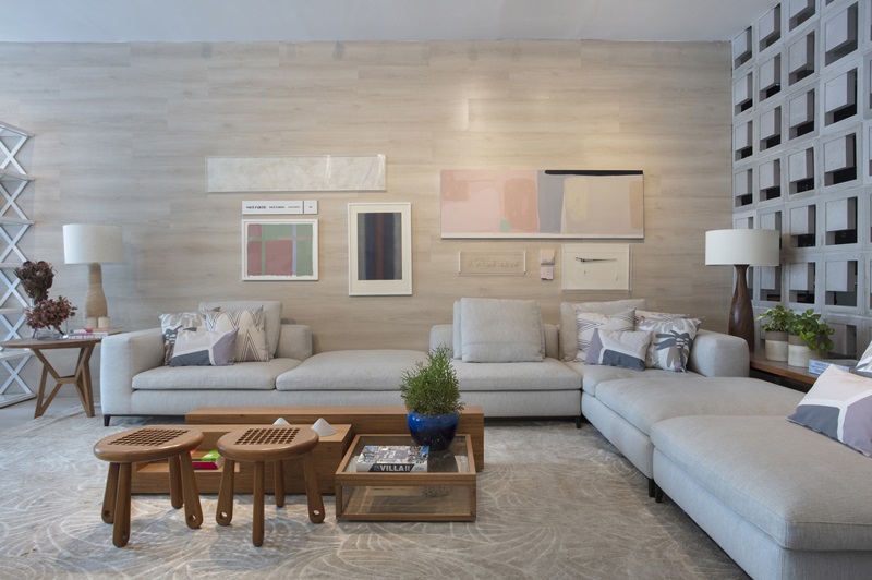Estar da Casa, assinado pela arquiteta Patricia Fiuza para a 15ª edição da Morar Mais por menos Rio, é um espaço de 60m² inspirado nas mulheres, aconchegante e sofisticado, evidenciando o estilo de uma mulher contemporânea e atemporal. O piso em madeira é replicado em uma das paredes, formando um “L”, enquanto as demais paredes e o teto tem a textura de cimento, criando um contraste na composição. A decoração traz detalhes em cinza, branco, bege, verde e rosa, além do tom de madeira clara, que remetem ao equilíbrio e harmonia buscados no projeto.
