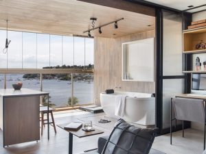 J1 ARQUITETURA E ENGENHARIA transforma apartamento de 45 m2 em um loft de estilo industrial contemporâneo, com espaços totalmente integrados. Um dos destaques do projeto é a banheira fora do banheiro, posicionada ao lado da cozinha e de frente para o mar