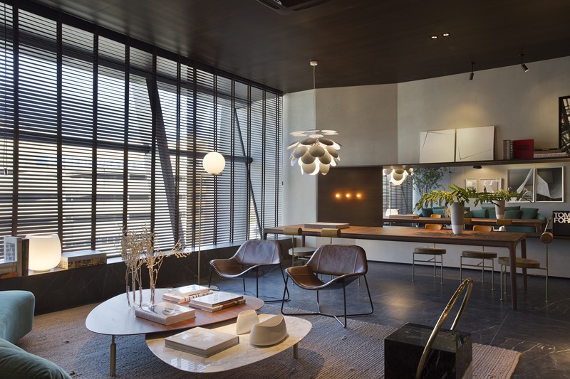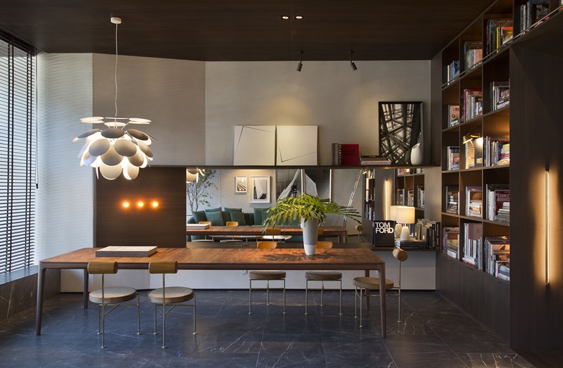 “A ideia do projeto é desconstruir um ambiente tradicionalmente comercial e transformá-lo em um espaço flexível a diferentes conceitos e segmentos de arquitetura. Por se tratar de uma mostra referência em arquitetura e design, parto da premissa que a livraria age como “um descortinar do ambiente”. Para que o grande destaque fosse além da ideia livraria cotidiana, trago um ambiente com uma pegada de lounge, onde diferentes referências se misturam e um caráter intimista e acolhedor paira em cada detalhe”, explica Leandro.
