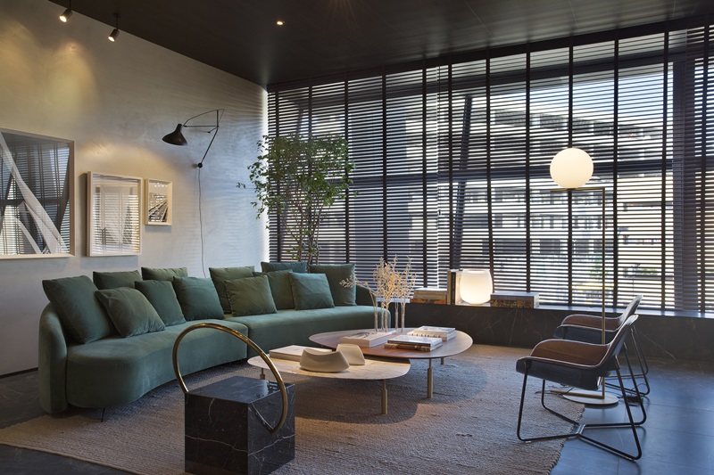 Os tons mais escuros, como marrom e preto, estão presentes na maior parte do espaço. A marcenaria foi desenvolvida pela Todeschini e o amadeirado da linha malbec esta presente em quase todo o ambiente, da estante até a forração do teto. Este conceito foi empregado para dar unidade ao espaço. O sofá, que capta a atenção do visitante pelo seu formato, também é logo notado pelo tom verde e aveludado; forma cor e proporção são os pontos altos quando escolhemos peças que vai ser elementos chave.