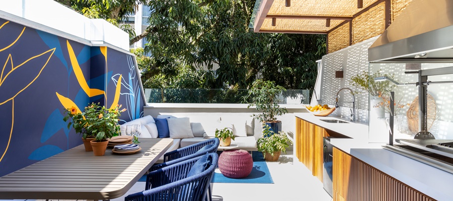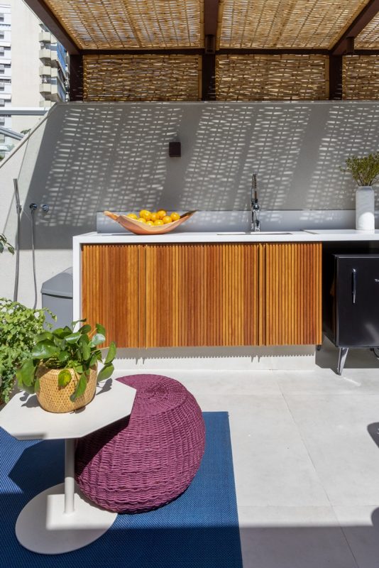 Subindo para o primeiro pavimento, ficam a suíte do casal, que ganhou uma decoração aconchegante e funcional, e um quarto de hóspedes. Mas é na cobertura que mora o grande charme do apê: um pequeno terraço onde os jovens moradores recebem os amigos para encontros, churrascos e festas. A parede com pintura artística de Giuliana Favero é o grande destaque do espaço, que tem ainda banco de azulejos e uma pequena área coberta para a cozinha de apoio que ganhou cobertura de aço corten e palha.