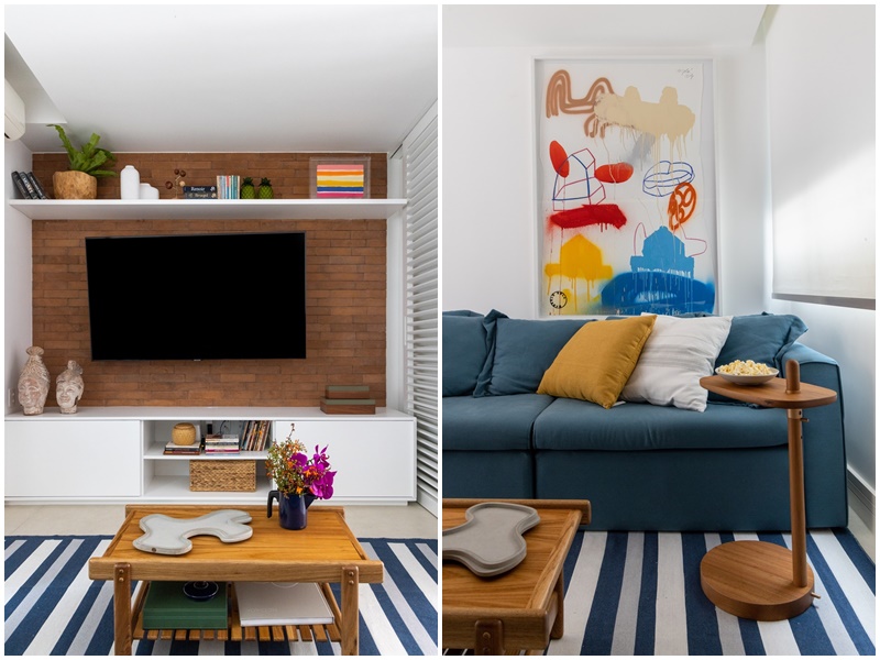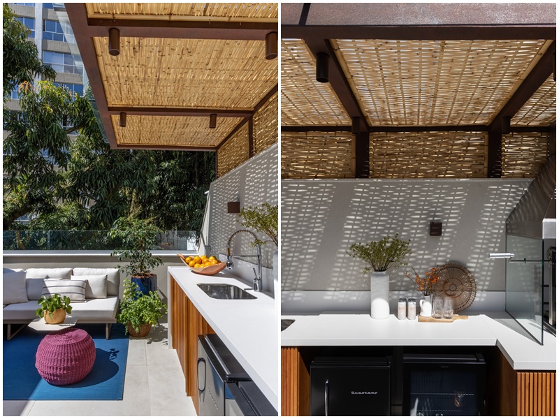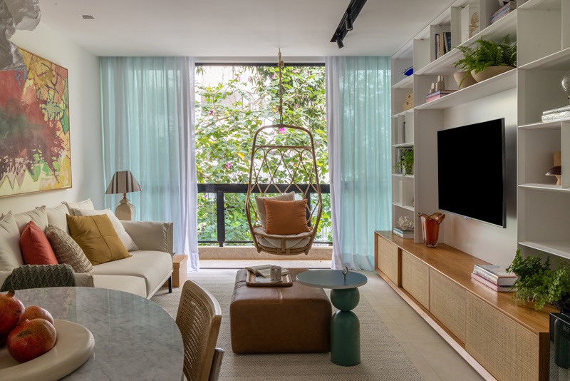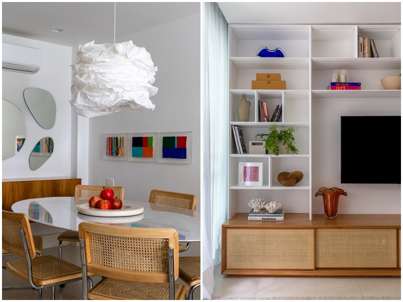 “Esse apartamento tem bastante verde nas janelas. Então, optamos por também investir em materiais naturais em tons sóbrios como a palha e a peroba do campo para trazer esse ar acolhedor que era um desejo dos moradores – explica Manu.“