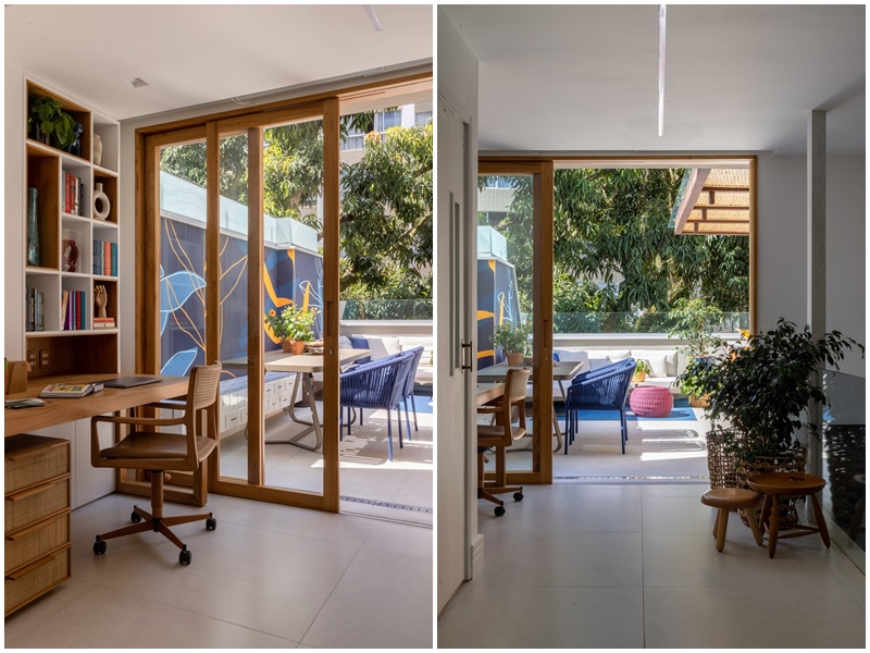 O andar ainda tem um pequeno home-office integrado a essa área externa e uma sala de TV com esquadria de madeira que pode ser totalmente fechada, para se tornar um terceiro quarto eventualmente. Tudo bem funcional, charmoso e acolhedor.
