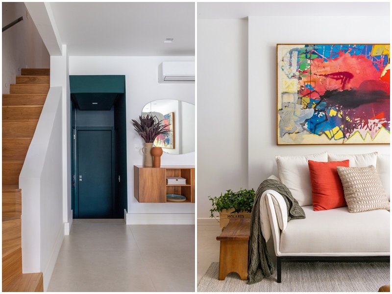 Logo na entrada, o primeiro impacto: o hall teve todas as paredes pintadas de verde esmeralda criando uma caixa que destaca a entrada do apartamento e ainda camufla as portas da cozinha e do lavabo. No térreo, ficam estar e jantar que tiveram suas posições invertidas de forma que as árvores da fachada do prédio funcionem como um fundo perfeito para o espaço, trazendo a natureza para dentro. Espelhos orgânicos, a luminária escultural em papel do designer Thomaz Velho e o uso de materiais como palha, madeira e linho ajudam a trazer o ar de aconchego.