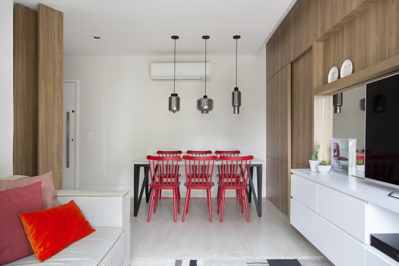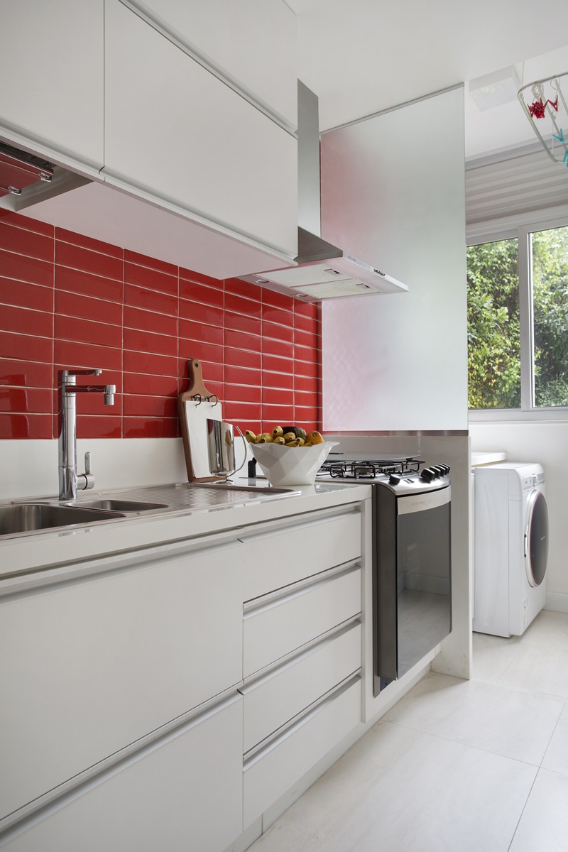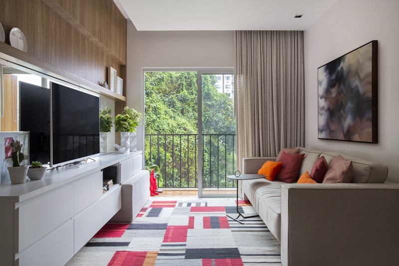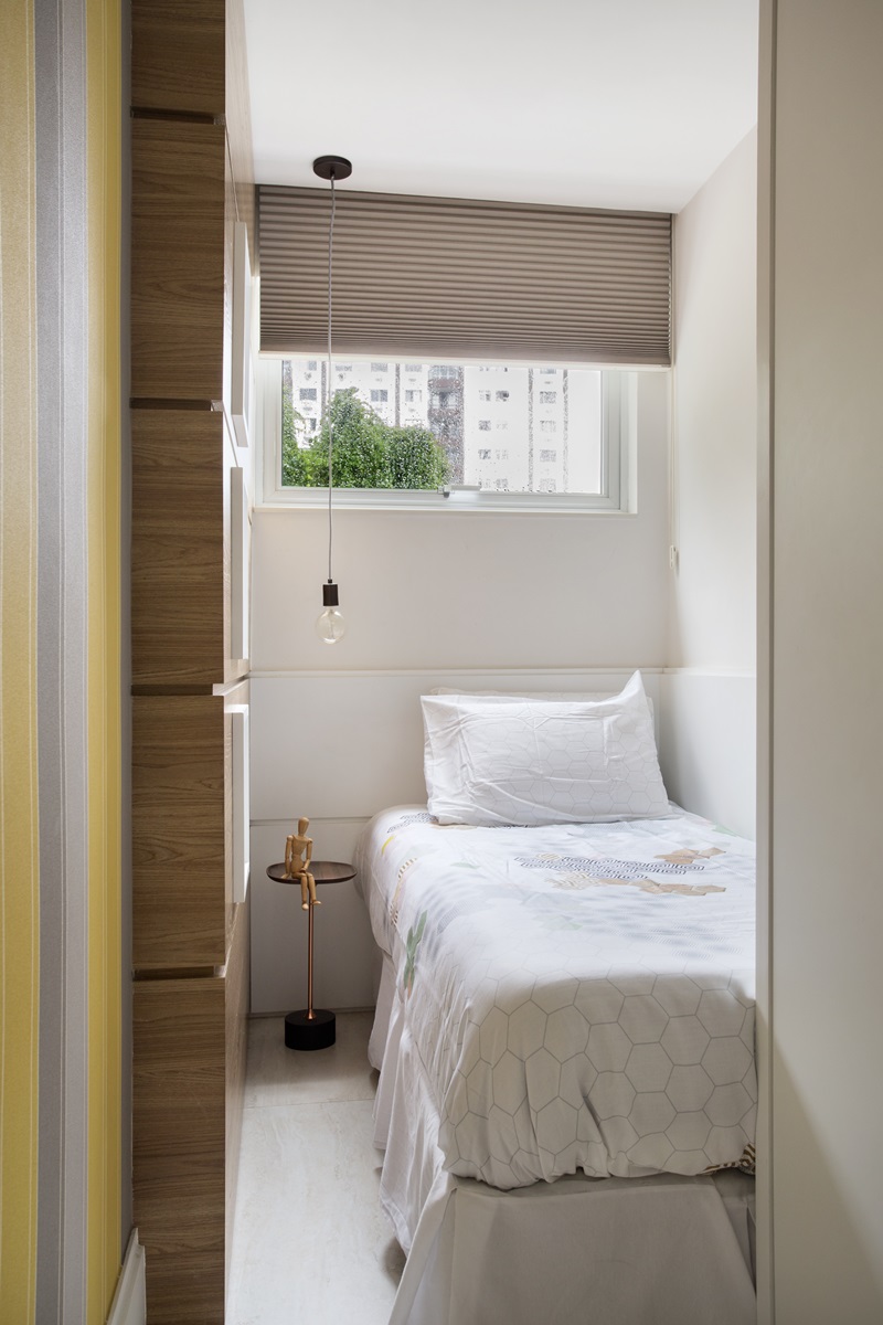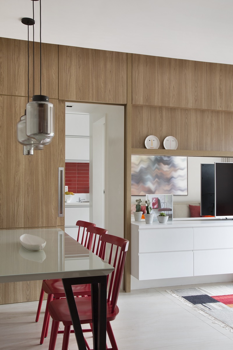 A decoração é minimalista, com poucos objetos decorativos para que a arquitetura e soluções encontradas sejam mais visíveis. De visual contemporâneo, sem perder as referências afetivas da infância no interior de Minas Gerais, o apartamento tem cara de casa, com a personalidade da moradora presente nos detalhes, como casca de tijolo de demolição e cortina de crochê. Um visual urbano e contemporâneo, porém com um toque de rústico.