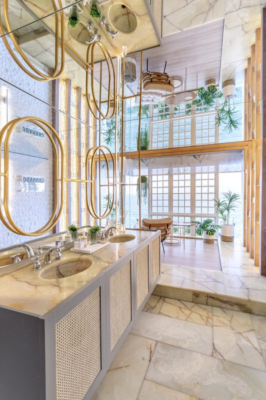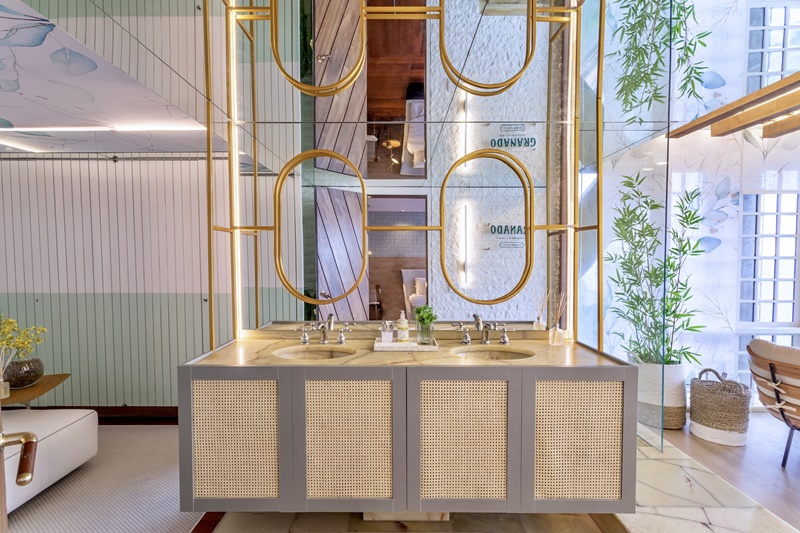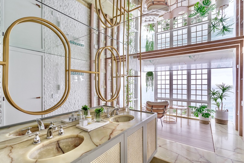 Estreantes no evento, o ambiente feito por elas é batizado de “Sala de banho e SPA”, e tem como inspiração o estilo urban jungle. “Nós incluímos plantas e elementos naturais na decoração, proporcionando aos usuários uma conexão com a natureza”, conta Mônica. “O ponto de partida é a vista para o mar que nosso ambiente tem. Os tons belos das praias cariocas serviram de inspiração para trazer a natureza para o espaço, conectando exterior e interior”.