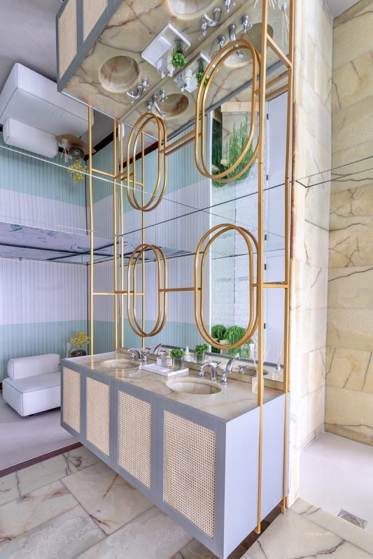 O espaço de 30 m² já contava com uma banheira no piso, que não cabia no conceito do projeto, o que gerou um desafio a mais para as arquitetas em criar um ambiente que isolasse a banheira e mantivesse a ideia de um spa. Da casa, foram aproveitados ainda o piso, bancada, cubas em mármore ônix e os armários em madeira que foram pintados.