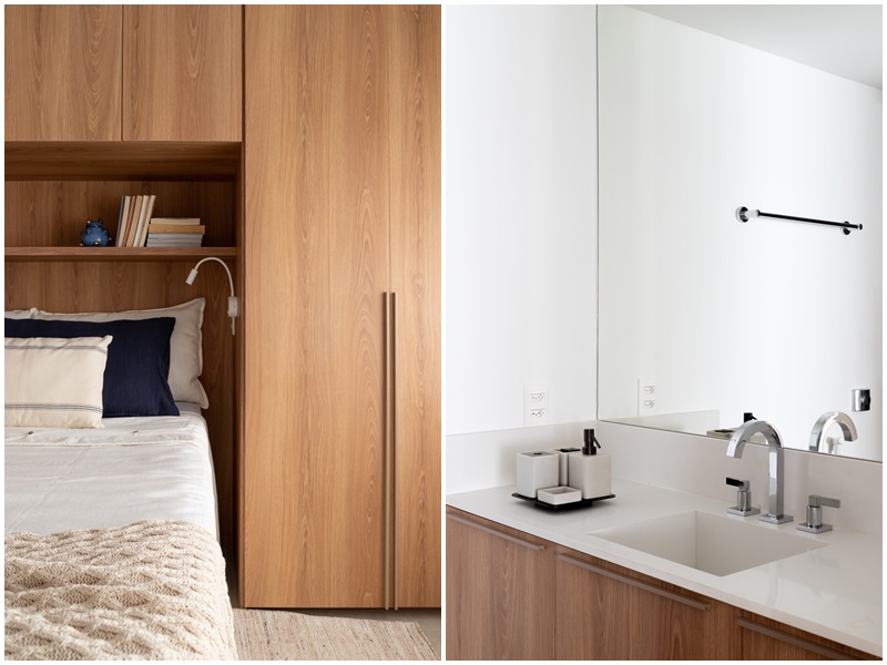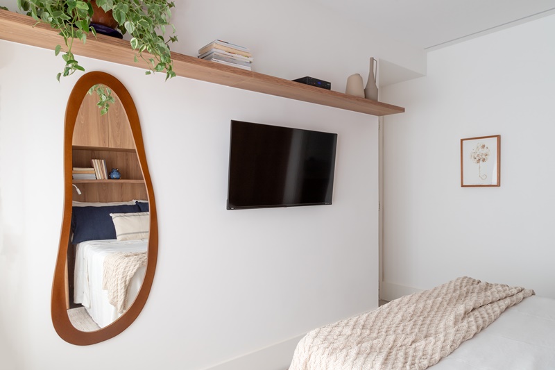 No quarto, os destaques são um espelho de corpo, com um formato oval assimétrico e um grande armário de madeira, que otimiza o espaço e ajuda na organização sem perder o estilo.