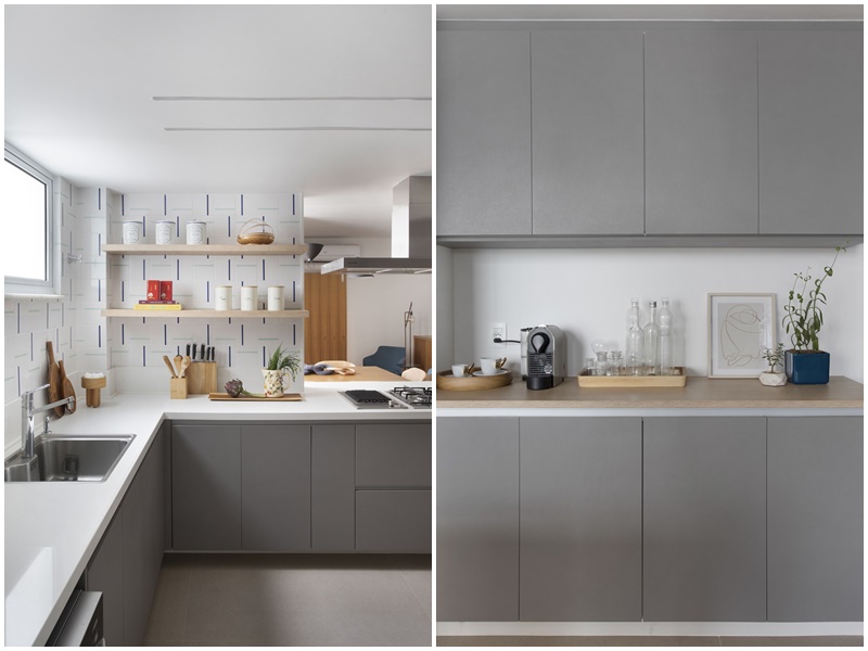 Para criar uma unidade visual no imóvel, a arquiteta usou o mesmo piso de porcelanato cinza na área social, quartos e banheiros, e adotou o freijó natural na marcenaria presente em todos os cômodos. Na cozinha aberta para a sala, os armários tem cor cinza, enquanto as bancadas são de material claro (ora de pedra ou ora de melanina amadeirada) para contrabalançar e não pesar visualmente. Já o backsplash foi revestido em azulejo branco com estampa geométrica de traços minimalistas, em dois tons de azul. Todos os eletros tem acabamento em aço inox ou pintura prata para dar um toque de modernidade ao espaço.