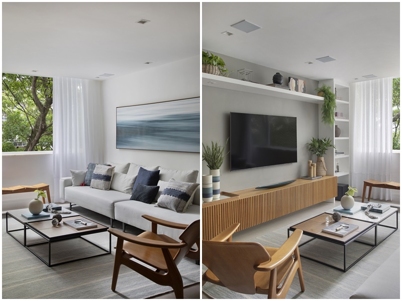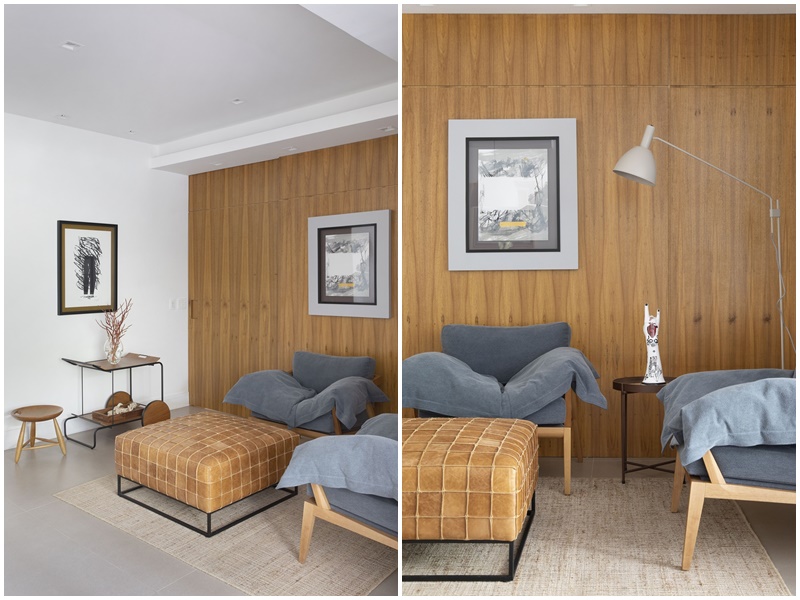 O projeto segue um estilo clean contemporâneo e atemporal que reflete, ao mesmo tempo, a jovialidade do casal e a elegância da profissão de ambos, com presença marcante da madeira através da marcenaria e do próprio mobiliário. “Em todos os meus projetos busco o equilíbrio de cores e materiais, transitando entre o frio e o quente para transmitir leveza e aconchego, ao mesmo tempo“, avalia Fernanda. Neste projeto, não poderia ser diferente. Os tons frios aparecem, por exemplo, no azul claro do tapete, das almofadas e do quadro grande acima do sofá, ou ainda no piso de porcelanato cinza com grande formato, enquanto a madeira e o couro em tom caramelo aquecem o décor, deixando os espaços mais acolhedores.