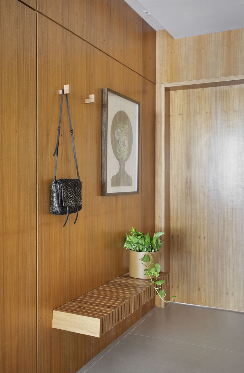 Outros destaques do projeto: o revestimento do box do banheiro do casal, em porcelanato que imita granilite aplicado no piso e nas paredes; o hall de entrada, que ganhou uma mini chapelaria com banquinho e cabides para apoiar os pertences de quem chega da rua.
