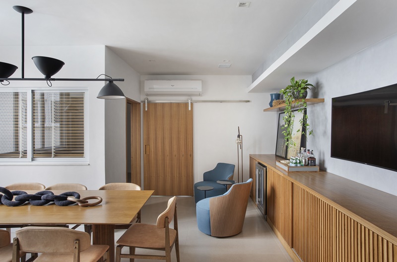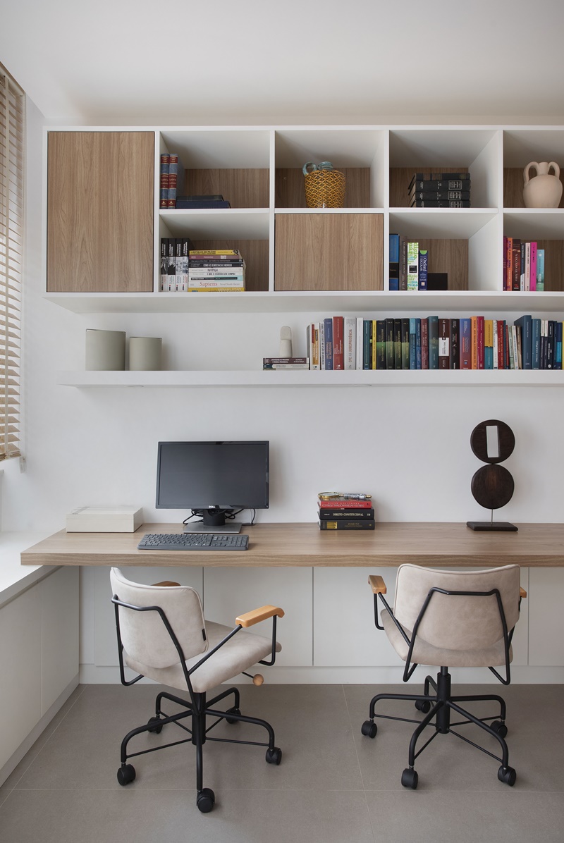 Como os clientes trabalham no mesmo escritório e costumam ter reuniões online simultâneas, desta vez eles pediram dois home offices separados. E como eles tem hábito de receber amigos e familiares em casa, a arquiteta sugeriu integrar a cozinha com a sala de jantar, acrescentando ainda adega, cervejeira, churrasqueira, tv e som. Já o banheiro próximo a esta área também foi pensado para servir de apoio no pós-praia, evitando assim que as pessoas circulem com areia nos pés na área social do apartamento.