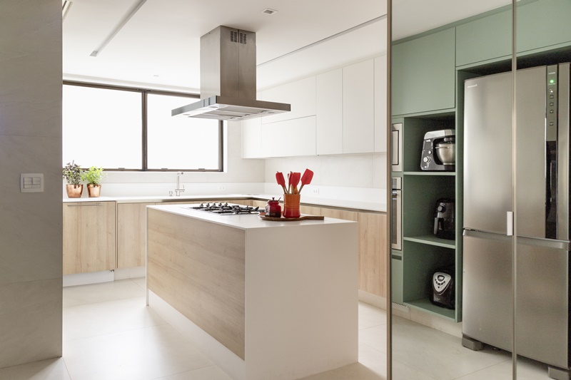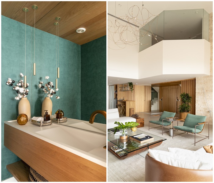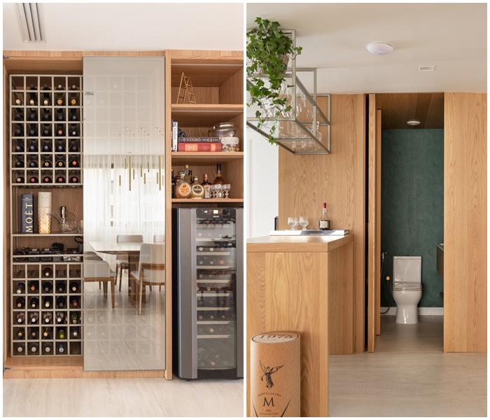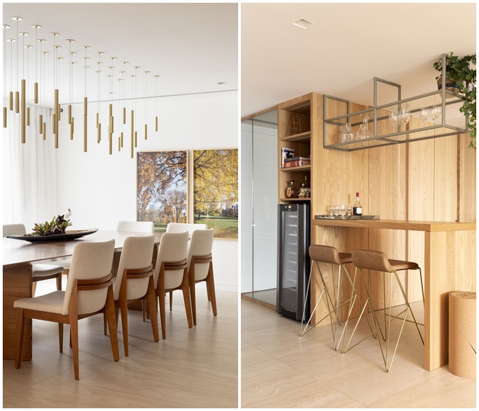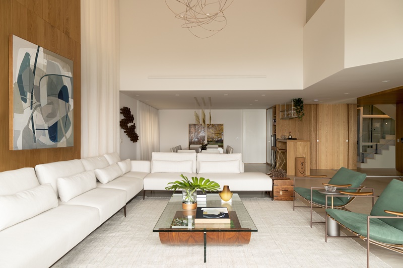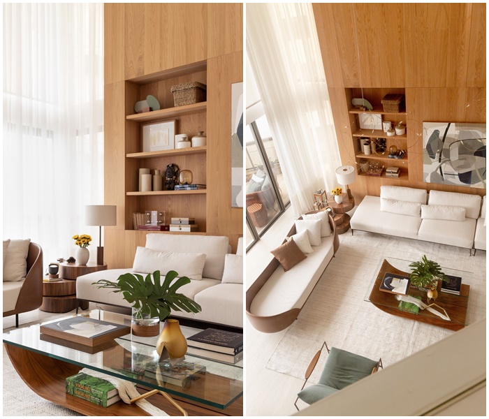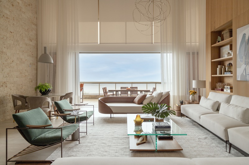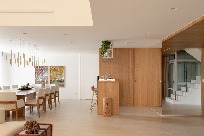 Segundo a arquiteta, no geral, o projeto buscou criar um apartamento contemporâneo, cozy e elegante, com materiais e soluções práticas e funcionais, já que é o lar de uma família numerosa. Na decoração, praticamente é tudo novo, com exceção de alguns quadros, objetos de decoração, mesa de centro e mesa lateral do estar, que foram aproveitados da residência anterior. Na área social, o acabamento em carvalho natural das marcenarias “aquece” o espaço, deixando-o mais acolhedor, e contrasta com o piso frio no padrão travertino (porcelanato de grande formato), cuja tonalidade (nude) está presente também nas cortinas, sofás e cadeiras. Já o par de poltronas ganhou estofamento em tecido verde para trazer um ponto de cor ao espaço, sem pesar visualmente.