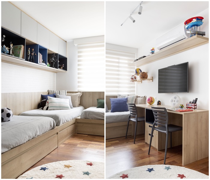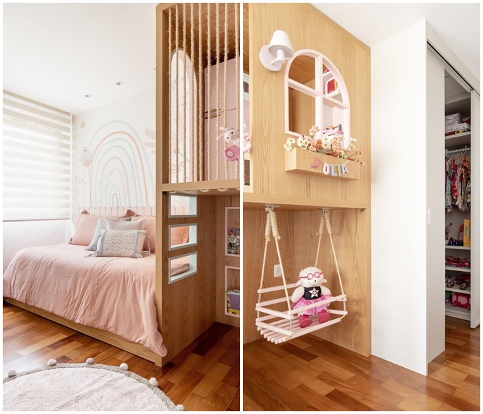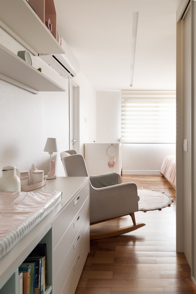 O projeto traçado pela arquiteta contemplou todos os cômodos do apartamento, com algumas modificações na planta do imóvel. O escritório da esposa foi instalado (e isolado) em uma área sem utilidade na escada, dois banheiros foram invertidos para que (por questões alérgicas) o banheiro da menina de 2 anos tivesse uma janela voltada para o exterior, a suíte máster ganhou um closet para cada cônjuge e a planta do banheiro do casal foi alterada. Já na área social, a arquiteta camuflou o lavabo em painéis de marcenaria e projetou do zero uma sala de tv, isolada do living.