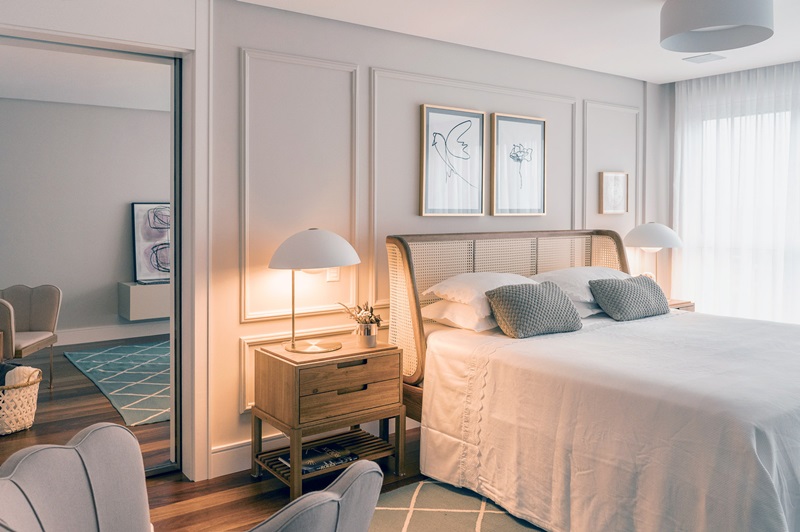 Da união de dois apartamentos, comprados pelo casal ainda em construção, foi possível criar um novo imóvel com 320m2, definir todos os revestimentos, distribuir ambientes confortáveis, bem iluminados e com boa ventilação. O setor íntimo compreende uma circulação com roupeiros, sala de cinema, suíte de hóspedes, suíte do bebê e suíte do casal com closet.