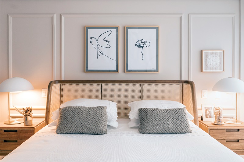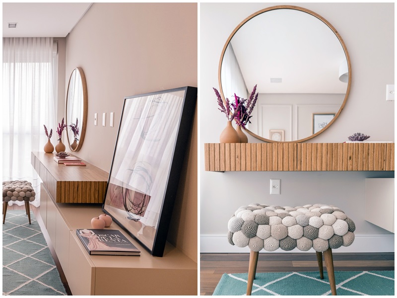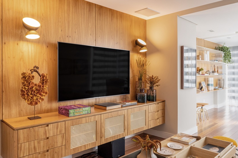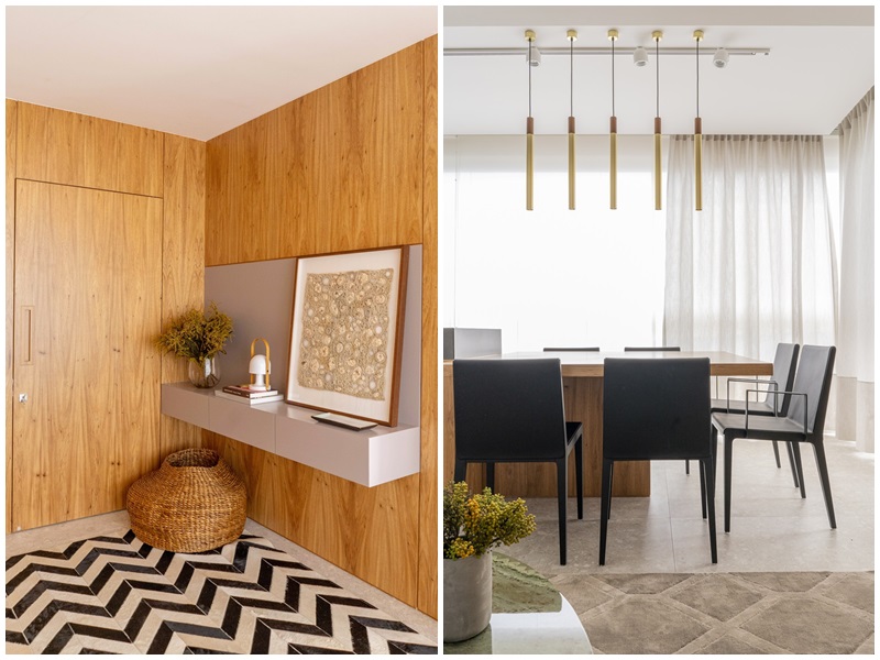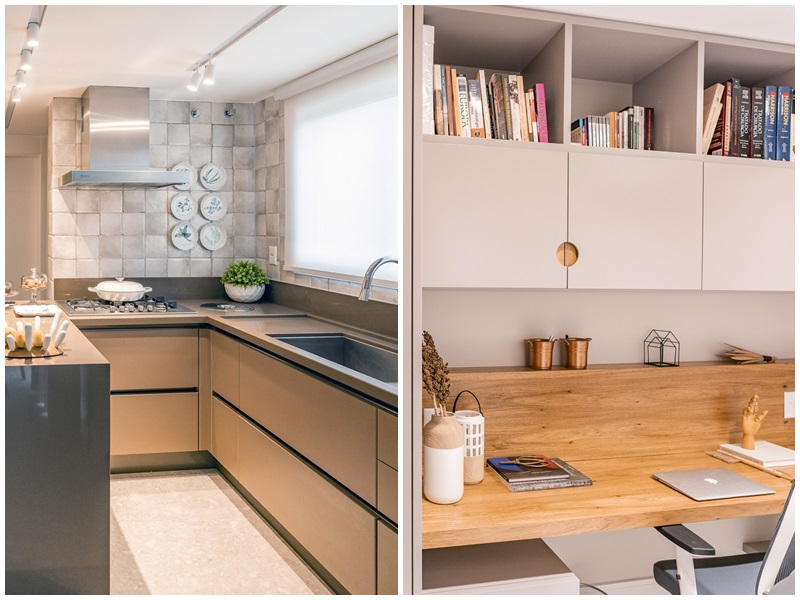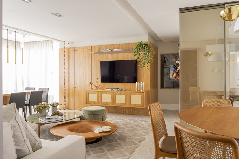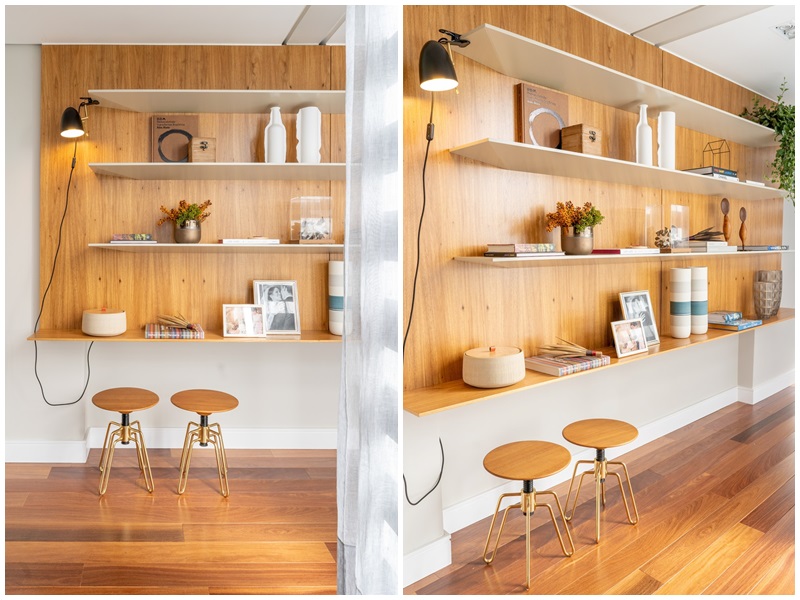A base neutra mescla beges, cinzas e branco. A marcenaria desenhada exclusivamente para o projeto apresenta predomínio da madeira natural Freijó que percorre painéis, bancadas e estantes. Móveis de design foram escolhidos com máximo critério buscando conforto e beleza, valorizando o resultado final.