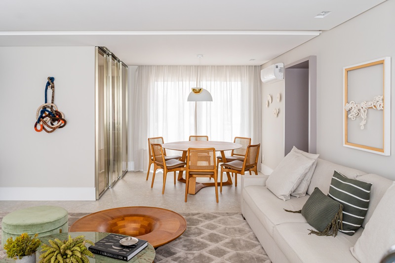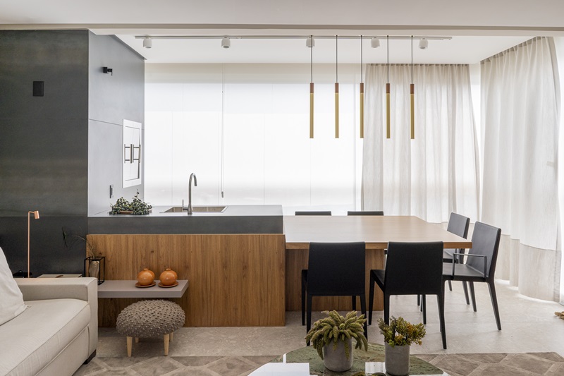 O setor social se comunica com a cozinha através de portas deslizantes em tom bronze (Florense).