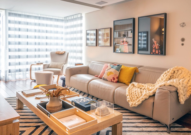 Os tapetes trazem movimento através de desenhos geométricos, além de proporcionarem contrastes interessantes com cores que realçam o mobiliário.