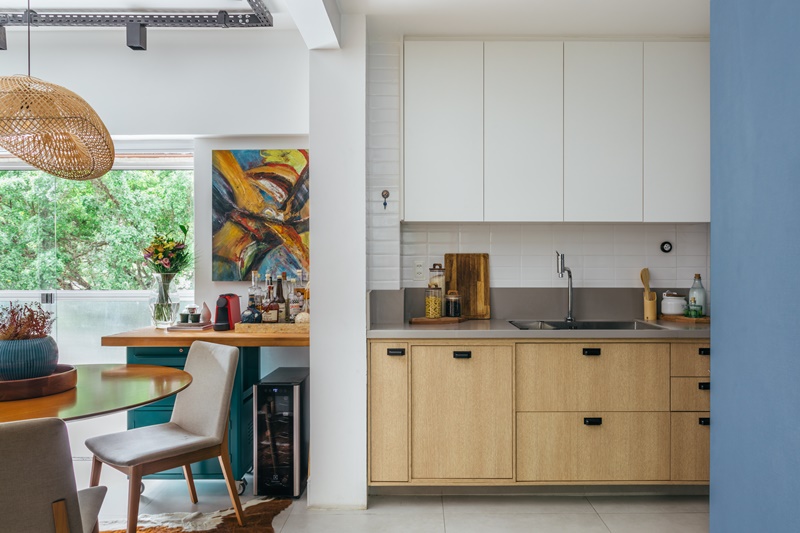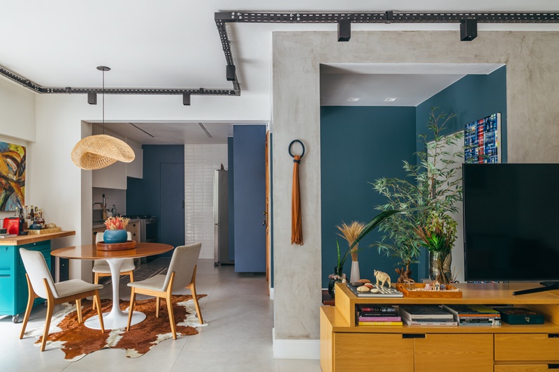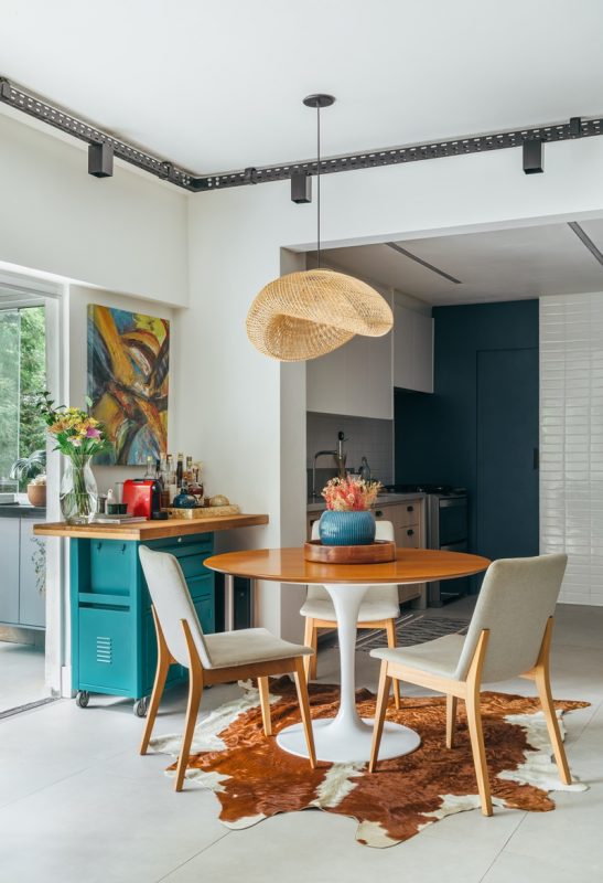 A integração dos espaços foi uma estratégia adotada em todo o apartamento para criar uma atmosfera moderna e iluminada. Aberta para sala, a varanda fica na altura da copa das árvores e parece estar cercada por um jardim, com direito à churrasqueira e tudo mais! Como os cômodos eram todos fechados e os espaços pequenos, a solução foi derrubar todas as paredes, inclusive a do hall. Assim, o elevador passou a chegar dentro da casa que tem apenas um apartamento por andar. A cozinha ficou totalmente aberta para sala de estar e emendou também na de jantar. O azul, cor favorita de todos, foi o fio condutor do projeto, que também inclui móveis e objetos da família.