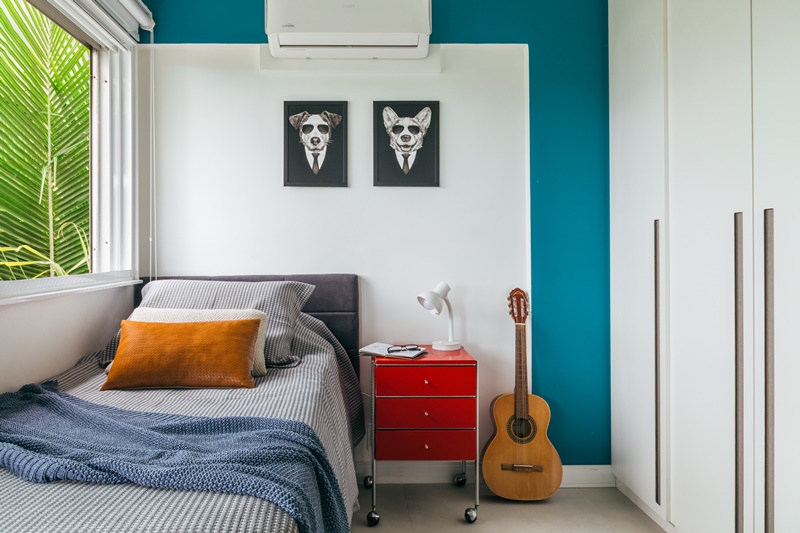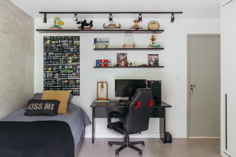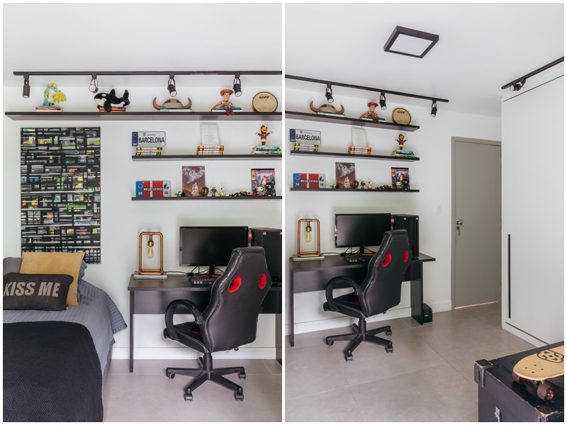 Ao projetar os quartos dos filhos, a mãe-arquiteta teve o cuidado de refletir a personalidade de cada um. Com uma pegada bem moderna, o quarto do filho mais velho, de quinze anos, ganhou parede de cimento queimado, mesa de estudo, prateleiras, baú e trilhos de iluminação pretos. Além de uma mesa de estudo e elementos decorativos, como skate e placas de metal de diferentes países e toy art, complementam o décor. Já no quarto do segundo filho, de onze anos, o azul aparece mais uma vez, trazendo mais cor ao ambiente. A decoração descontraída com quadros divertidos e instrumentos musicais, é complementada por uma cama estofada com lona estonada cinza e mesa de cabeceira vermelha.