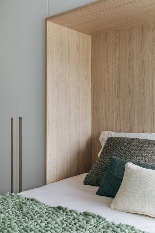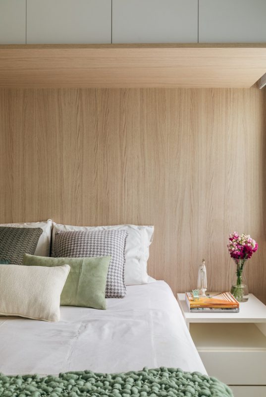 O quarto do casal tem apenas 14 m2 e era comprido. Então, a cama ganhou destaque com um requadro da marcenaria e o espaço, apesar do aconchego da madeira, passou a ser amplo. A cama baú e a sapateira ripada também foram planejadas para otimizar os espaços.